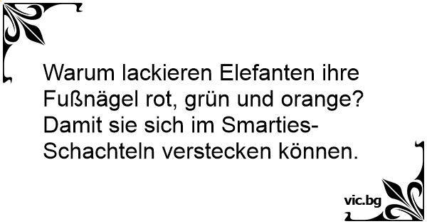 Warum lackieren Elefanten ihre Fußnägel rot, grün und orange? Damit sie sich im Smarties- Schachteln verstecken können.