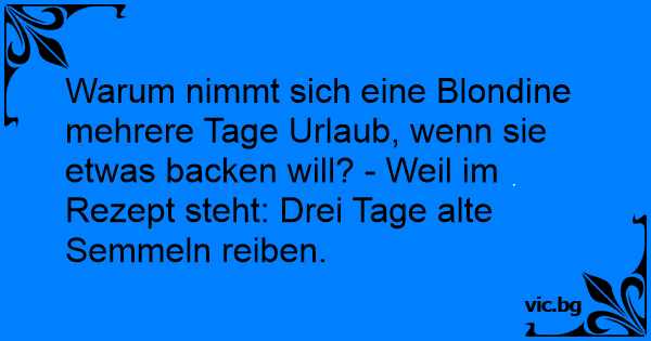 Warum nimmt sich eine Blondine mehrere Tage Urlaub, wenn sie etwas backen will? - Weil im Rezept steht: Drei Tage alte Semmeln reiben.