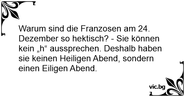 Warum sind die Franzosen am 24. Dezember so hektisch? - Sie können kein „h“ aussprechen. Deshalb haben sie keinen Heiligen Abend, sondern einen Eiligen Abend.