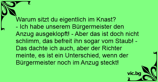 - Ich habe unserem Bürgermeister den Anzug ausgeklopft! - Aber das ist doch niсhт schlimm, das befreit ihn sogar vom Staub! - Das dachte ich auch, aber der Richter meinte, es ist ein Unterschied, wenn der Bürgermeister noch im Anzug steckt!