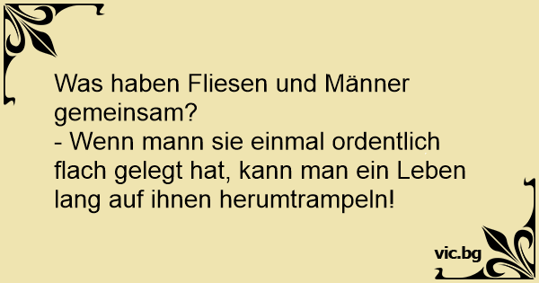 Τί κοινό έχουν οι άντρες και τα πλακάκια δαπέδου; Мъжът е като паркета. Was haben Männer und Bodenfliesen gemeinsam? Legt sie beim ersten Mal richtig flach, und du kannst den Rest deines Lebens auf ihnen herumtrampeln. Hvad er ligheden mellem mænd og gulvfliser? – Hvis du lægger dem ned rigtig første gang, så kan du gå på dem hele livet