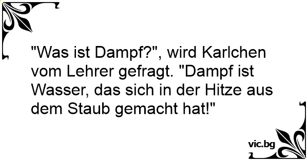 "Was ist Dampf?", wird Karlchen vom Lehrer gefragt. "Dampf ist Wasser, das sich in der Hitze aus dem Staub gemacht hat!"