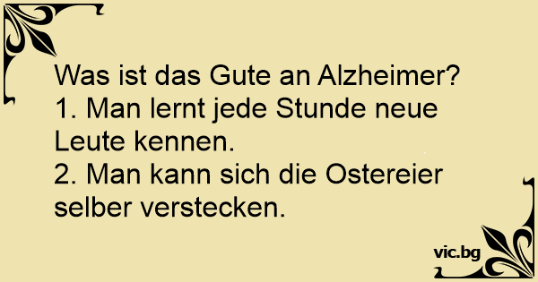 Ce qu'il y a de bien dans la maladie d'Alzheimer :C'est qu'on peut toute l'année chercher les oeufs de Pâques que l'on a cachésOn se fait tous les jours de nouveaux amis