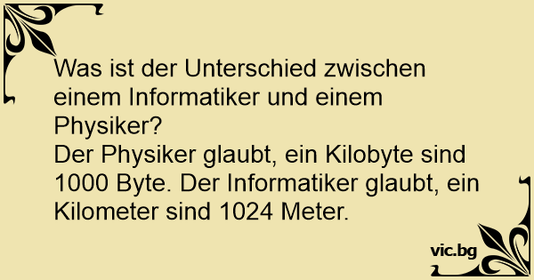 Der Physiker glaubt, ein Kilobyte sind 1000 Byte. Der Informatiker glaubt, ein Kilometer sind 1024 Meter.