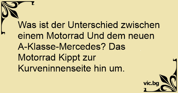 Was ist der Unterschied zwischen einem Motorrad Und dem neuen A-Klasse-Mercedes? Das Motorrad Kippt zur Kurveninnenseite hin um.
