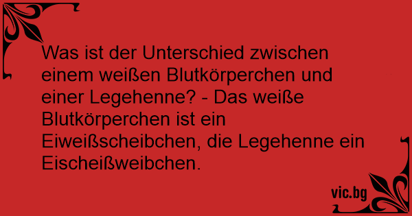 Was ist der Unterschied zwischen einem weißen Blutkörperchen und einer Legehenne? - Das weiße Blutkörperchen ist ein Eiweißscheibchen, die Legehenne ein Eischeißweibchen.