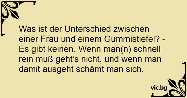 Was ist der Unterschied zwischen einer Frau und einem Gummistiefel? - Es gibt keinen. Wenn man(n) schnell rein muß geht’s niсhт, und wenn man damit ausgeht schämt man sich.
