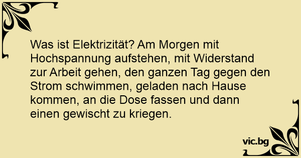 Was ist Elektrizität? Am Morgen mit Hochspannung aufstehen, mit Widerstand zur Arbeit gehen, den ganzen Tag gegen den Strom schwimmen, geladen nach Hause kommen, an die Dose fassen und dann einen gewischt zu kriegen.