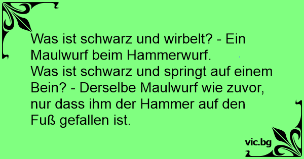 Was ist schwarz und springt auf einem Bein? - Derselbe Maulwurf wie zuvor, nur dass ihm der Hammer auf den Fuß gefallen ist.