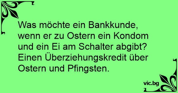 Was möchte ein Bankkunde, wenn er zu Ostern ein Kondom und ein Ei am Schalter abgibt? Einen Überziehungskredit über Ostern und Pfingsten.