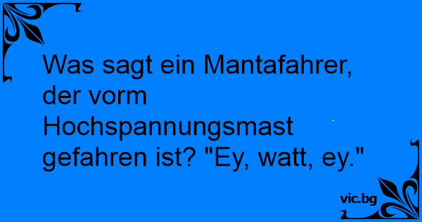 Was sagt ein Mantafahrer, der vorm Hochspannungsmast gefahren ist? "Ey, watt, ey."