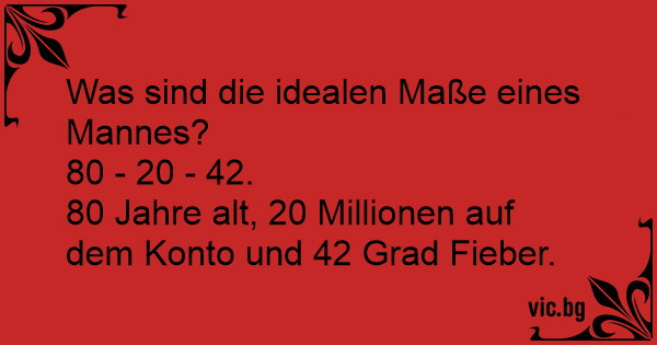 Idealmaße eines Mannes Какви са идеaлните мерки за една жена? Кои са идеалните мъжки мерки : 90 100 40: Idealmaße eines Mannes: 90-40-90? 1) 90 Jahre. 2) 40 Grad Fieber. 3) 90 Millionen auf dem Konto. Jakie są idealne wymiary mężczyzny? - 90/60/42. 90 lat, 60 milionów na koncie i 42 stopnie gorączki. De perfekte mål De perfekte mål for en kvinde er: 90 - 60 - 42. 90 år gammel, 60 millioner på kontoen og 42 grader i feber.