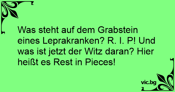 Was steht auf dem Grabstein eines Leprakranken? R. I. P! Und was ist jetzt der Witz daran? Hier heißt es Rest in Pieces!