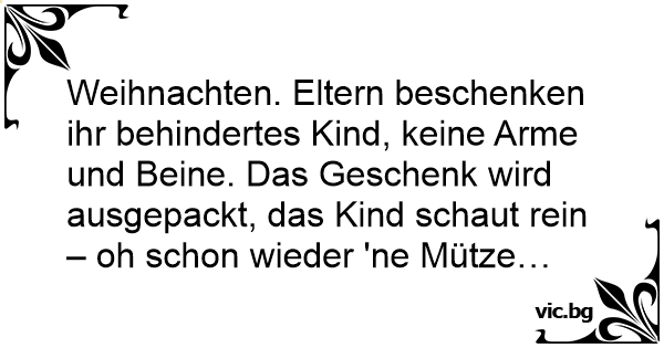 Weihnachten. Eltern beschenken ihr behindertes Kind, keine Arme und Beine. Das Geschenk wird ausgepackt, das Kind schaut rein – oh schon wieder 'ne Mütze…