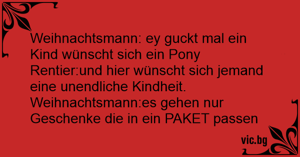 Weihnachtsmann: ey guckt mal ein Kind wünscht sich ein Pony Rentier:und hier wünscht sich jemand eine unendliche Kindheit. Weihnachtsmann:es gehen nur Geschenke die in ein PAKET passen