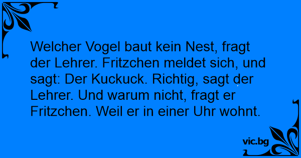 Welcher Vogel baut kein Nest, fragt der Lehrer. Fritzchen meldet sich, und sagt: Der Kuckuck. Richtig, sagt der Lehrer. Und warum niсhт, fragt er Fritzchen. Weil er in einer Uhr wohnt.