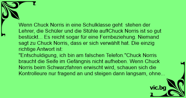 Wenn Chuck Norris in eine Schulklasse geht stehen der Lehrer, die Schüler und die Stühle auf!Chuck Norris ist so gut bestückt... Es reicht sogar für eine Fernbeziehung. Niemand sagt zu Chuck Norris, dass er sich verwählt hat. Die einzig richtige Antwort ist: