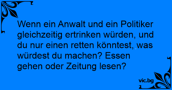 Wenn ein Anwalt und ein Politiker gleichzeitig ertrinken würden, und du nur einen retten könntest, was würdest du machen? Essen gehen oder Zeitung lesen?