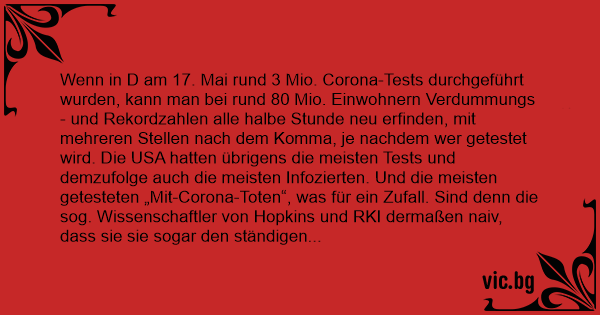 Wenn in D am 17. Mai rund 3 Mio. Corona-Tests durchgeführt wurden, kann man bei rund 80 Mio. Einwohnern Verdummungs- und Rekordzahlen alle halbe Stunde neu erfinden, mit mehreren Stellen nach dem Komma, je nachdem wer getestet wird. Die USA hatten übrigens die meisten Tests und demzufolge auch die meisten Infozierten. Und die meisten getesteten „Mit-Corona-Toten“, was für ein Zufall. Sind denn die sog. Wissenschaftler von Hopkins und RKI dermaßen naiv, dass sie sie sogar den ständigen Umfrage-„Werten“ in den Medien glauben, die da behaupten, stets 66, … % der Bürger würden die Maßnahmen der Regierung befürworten? Komischerweise wurde in der DDR stets über 90 % SED gewählt bei ebensolcher Wahlbeteiligung, eine Zustimmung zum damaligen Regime, wie es sie in der BRD gab. Das bedeutet, die Mehrheit ist laut Medien stets für die Regierung, und das Volk der DDR wollte Honecker & Co. behalten. Aber heute wissen wir natürlich, dass das Volk eh nix zu melden hat, es lebe die Deutsche Demokratische Republik! Bei „DDR“ und Demokratie fällt mir eine autentische Geschichte ein: Als ich damals bei der Vernehmung von 2 Stasi-Leuten auf deren Drängen sagte, „Ich bin Deutscher“, da war das falsch. Sie wollten ausdrücklich die Staatsbürgerschaft wissen. Da brachte ich meinen selber gemachten Witz an: