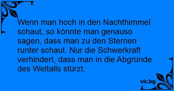 Wenn man hoch in den Nachthimmel schaut, so könnte man genauso sagen, dass man zu den Sternen runter schaut. Nur die Schwerkraft verhindert, dass man in die Abgründe des Weltalls stürzt.