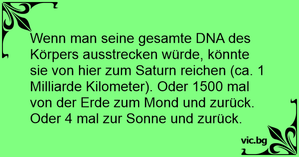 Wenn man seine gesamte DNA des Körpers ausstrecken würde, könnte sie von hier zum Saturn reichen (ca. 1 Milliarde Kilometer). Oder 1500 mal von der Erde zum Mond und zurück. Oder 4 mal zur Sonne und zurück.