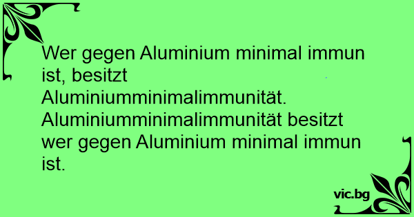 Wer gegen Aluminium minimal immun ist, besitzt Aluminiumminimalimmunität. Aluminiumminimalimmunität besitzt wer gegen Aluminium minimal immun ist.