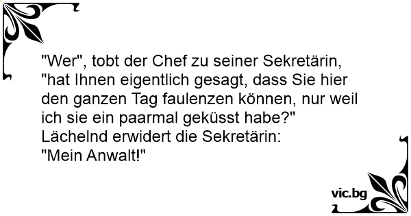 Chiste de la secretaria y el lio con el jefe Влиза секретарка при шефа и казва: Секретарка влезнала в кабинета на шефа си и казала: Орет новый русский на секретаршу: Der Chef ist sauer auf seine Sekretärin: "Wer hat Ihnen eigentlich gesagt, daß Sie hier im Büro nur faul herumhängen können, bloß weil ich Sie auf dem letzten Betriebsfest vernascht habe?" "Mein Anwalt!" Direktören till sekreteraren: - Vem har sagt att ni kan bära er åt hur som helst bara för att jag har kysst er ett par gånger? - Min advokat! Секретарката влегува кај шефот и вели: - Од овој момент платата ќе ми биде 1000 евра и ќе имам 4 слободни денови во неделата... Шефот со сарказам: - А кој ти го рече тоа мила? - Мојот гинеколог, а... El jefe le dice a la secretaria: - Oye, ¿pero a ti quién te ha dicho que puedes pasarte dando vueltas todo el día sin trabajar, sólo porque nos acostamos una noche? - Mi abogado...Cupones y... Jefe: ¿ Quién te ha dicho que puedes pasarte dando vueltas sin trabajar todo El día, sólo porque tuvimos un rollo? Secretaria: Mi abogado... Firmos savininkas rėkia ant sekretorės: - Tu ką čia dabar išsigalvoji? Manai, kad jei porą kartų tave nusivedžiau į kavinę ir į lovą pasiguldžiau, tai gali nedirbti?! - Taip! - atsako sekretorė. -... Priekšnieks brēc uz sekretāri: "Ko tu iedomājies - tas, ka es tevi pāris reizes aizvedu uz krogu un dalīju ar tevi gultu - tev dod tiesības vairāk nestrādāt???" "Jā," atbild sekretāre. "Kas ta tev...