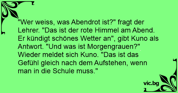 "Wer weiss, was Abendrot ist?" fragt der Lehrer. "Das ist der rote Himmel am Abend. Er kündigt schönes Wetter an", gibt Kuno als Antwort. "Und was ist Morgengrauen?" Wieder meldet sich Kuno. "Das ist das Gefühl gleich nach dem Aufstehen, wenn man in die Schule muss."