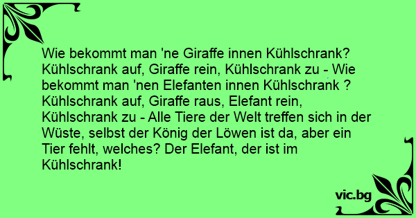 Wie bekommt man 'ne Giraffe innen Kühlschrank? Kühlschrank auf, Giraffe rein, Kühlschrank zu - Wie bekommt man 'nen Elefanten innen Kühlschrank ? Kühlschrank auf, Giraffe raus, Elefant rein, Kühlschrank zu - Alle Tiere der Welt treffen sich in der Wüste, selbst der König der Löwen ist da, aber ein Tier fehlt, welches? Der Elefant, der ist im Kühlschrank!