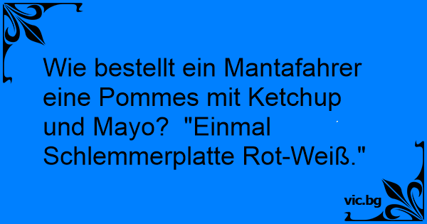 Wie bestellt ein Mantafahrer eine Pommes mit Ketchup und Mayo? "Einmal Schlemmerplatte Rot-Weiß."