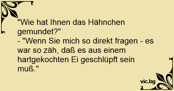 - "Wenn Sie mich so direkt fragen - es war so zäh, daß es aus einem hartgekochten Ei geschlüpft sein muß."