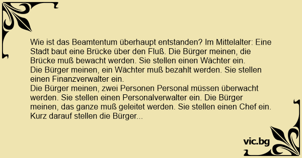Wie ist das Beamtentum überhaupt entstanden? Im Mittelalter: Eine Stadt baut eine Brücke über den Fluß. Die Bürger meinen, die Brücke muß bewacht werden. Sie stellen einen Wächter ein.