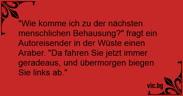 "Wie komme ich zu der nächsten menschlichen Behausung?" fragt ein Autoreisender in der Wüste einen Araber. "Da fahren Sie jetzt immer geradeaus, und übermorgen biegen Sie links ab."