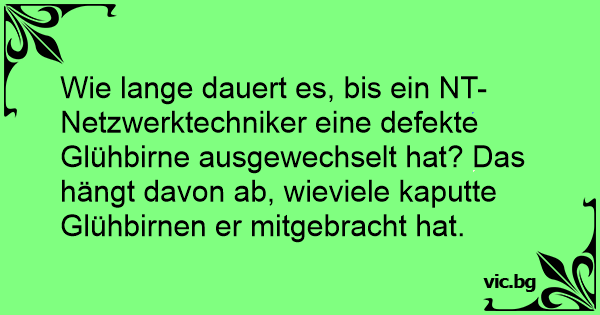 Wie lange dauert es, bis ein NT-Netzwerktechniker eine defekte Glühbirne ausgewechselt hat? Das hängt davon ab, wieviele kaputte Glühbirnen er mitgebracht hat.
