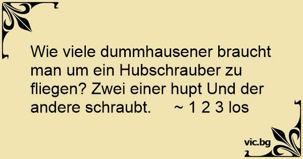 Wie viele dummhausener braucht man um ein Hubschrauber zu fliegen? Zwei einer hupt Und der andere schraubt. ~ 1 2 3 los