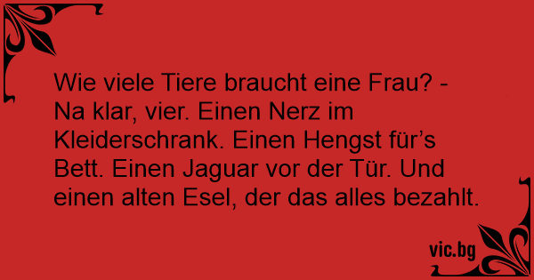 Kvinnor behöver 4 djur för att vara lycklig. En jaguar i garaget, en mink i garderoben, en hingst i sängen och en åsna som betalar allt. Mannen däremot är helt nöjd med en liten mus...