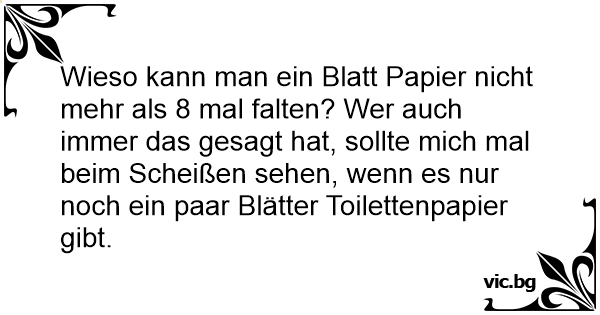Wieso kann man ein Blatt Papier niсhт mehr als 8 mal falten? Wer auch immer das gesagt hat, sollte mich mal beim Scheißen sehen, wenn es nur noch ein paar Blätter Toilettenpapier gibt.