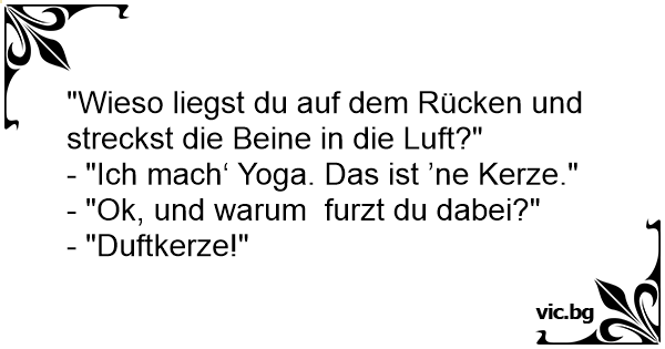 Wenn ein Yogalehrer seine Beine senkrecht nach oben streckt und dabei furzt, welche Yoga Figur stellt er da? Eine Duftkerze.