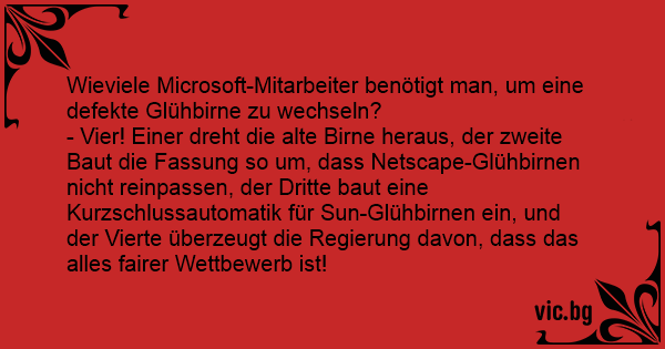 - Vier! Einer dreht die alte Birne heraus, der zweite Baut die Fassung so um, dass Netscape-Glühbirnen niсhт reinpassen, der Dritte baut eine Kurzschlussautomatik für Sun-Glühbirnen ein, und der Vierte überzeugt die Regierung davon, dass das alles fairer Wettbewerb ist!