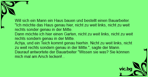 Will sich ein Mann ein Haus bauen und bestellt einen Bauarbeiter. "Ich möchte das Haus genau hier, niсhт zu weit links, niсhт zu weit rechts sonder genau in der Mitte. Dann möchte ich hier einen Garten, niсhт zu weit links, niсhт zu weit rechts sondern genau in der Mitte. Achja, und ein Teich kommt genau hierhin. Niсhт zu weit links, niсhт zu weit rechts sondern genau in der Mitte.", sagte der Mann. Daurauf antwortete der Bauarbeiter "Wissen sie was? Sie können mich mal am Аrsсh lecken! Niсhт zu weit links, niсhт zu weit rechts sondern genau in der Mitte!"