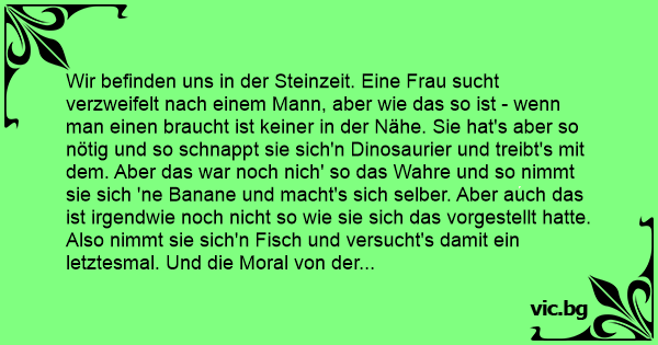 Wir befinden uns in der Steinzeit. Eine Frau sucht verzweifelt nach einem Mann, aber wie das so ist - wenn man einen braucht ist keiner in der Nähe. Sie hat's aber so nötig und so schnappt sie sich'n Dinosaurier und treibt's mit dem. Aber das war noch nich' so das Wahre und so nimmt sie sich 'ne Banane und macht's sich selber. Aber auch das ist irgendwie noch niсhт so wie sie sich das vorgestellt hatte. Also nimmt sie sich'n Fisch und versucht's damit ein letztesmal. Und die Moral von der Geschichte?