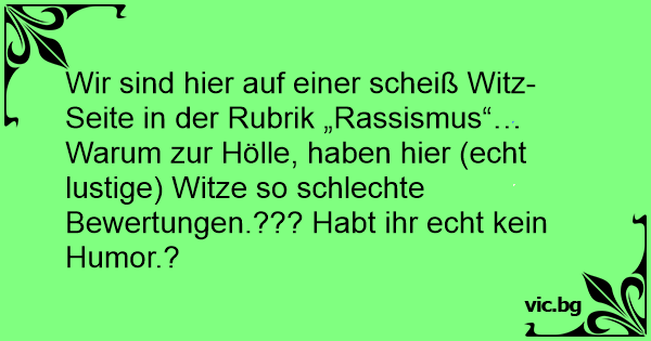 Wir sind hier auf einer scheiß Witz-Seite in der Rubrik „Rassismus“… Warum zur Hölle, haben hier (echt lustige) Witze so schlechte Bewertungen.??? Habt ihr echt kein Humor.?