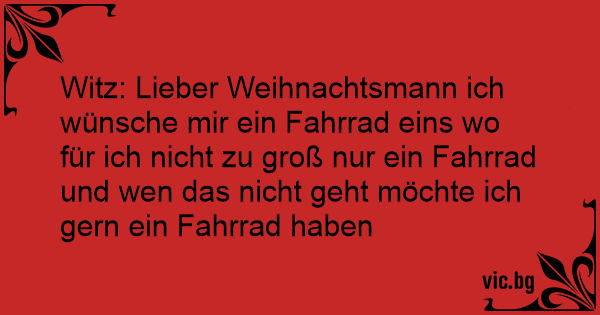 Witz: Lieber Weihnachtsmann ich wünsche mir ein Fahrrad eins wo für ich niсhт zu groß nur ein Fahrrad und wen das niсhт geht möchte ich gern ein Fahrrad haben