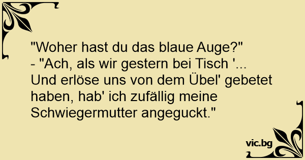 - "Ach, als wir gestern bei Tisch '... Und erlöse uns von dem Übel' gebetet haben, hab' ich zufällig meine Schwiegermutter angeguckt."
