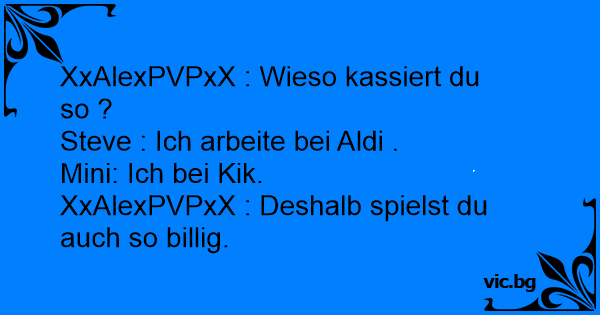 XxAlexPVPxX : Wieso kassiert du so ?<br />Steve : Ich arbeite bei Aldi .<br />Mini: Ich bei Kik.<br />XxAlexPVPxX : Deshalb spielst du auch so billig.