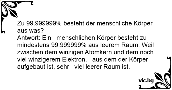 Antwort: Ein menschlichen Körper besteht zu mindestens 99.999999% aus leerem Raum. Weil zwischen dem winzigen Atomkern und dem noch viel winzigerem Elektron, aus dem der Körper aufgebaut ist, sehr viel leerer Raum ist.