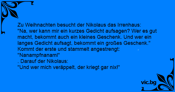 "Na, wer kann mir ein kurzes Gedicht aufsagen? Wer es gut macht, bekommt auch ein kleines Geschenk. Und wer ein langes Gedicht aufsagt, bekommt ein großes Geschenk."