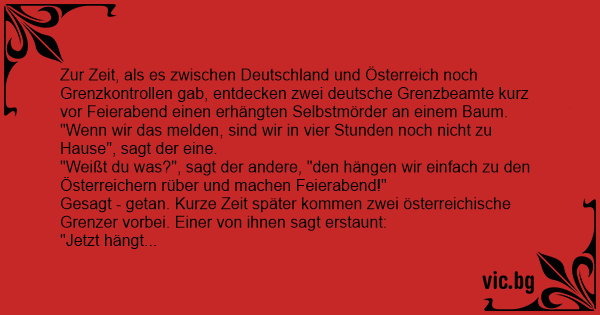 Zur Zeit, als es zwischen Deutschland und Österreich noch Grenzkontrollen gab, entdecken zwei deutsche Grenzbeamte kurz vor Feierabend einen erhängten Selbstmörder an einem Baum.
