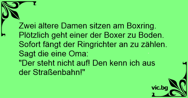 Zwei ältere Damen sitzen am Boxring. Plötzlich geht einer der Boxer zu Boden. Sofort fängt der Ringrichter an zu zählen.
