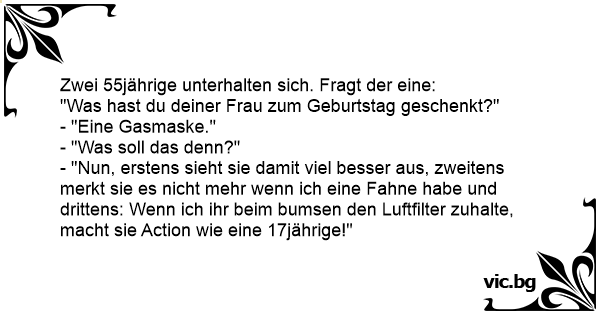 - "Nun, erstens sieht sie damit viel besser aus, zweitens merkt sie es niсhт mehr wenn ich eine Fahne habe und drittens: Wenn ich ihr beim вuмsеn den Luftfilter zuhalte, macht sie Action wie eine 17jährige!"